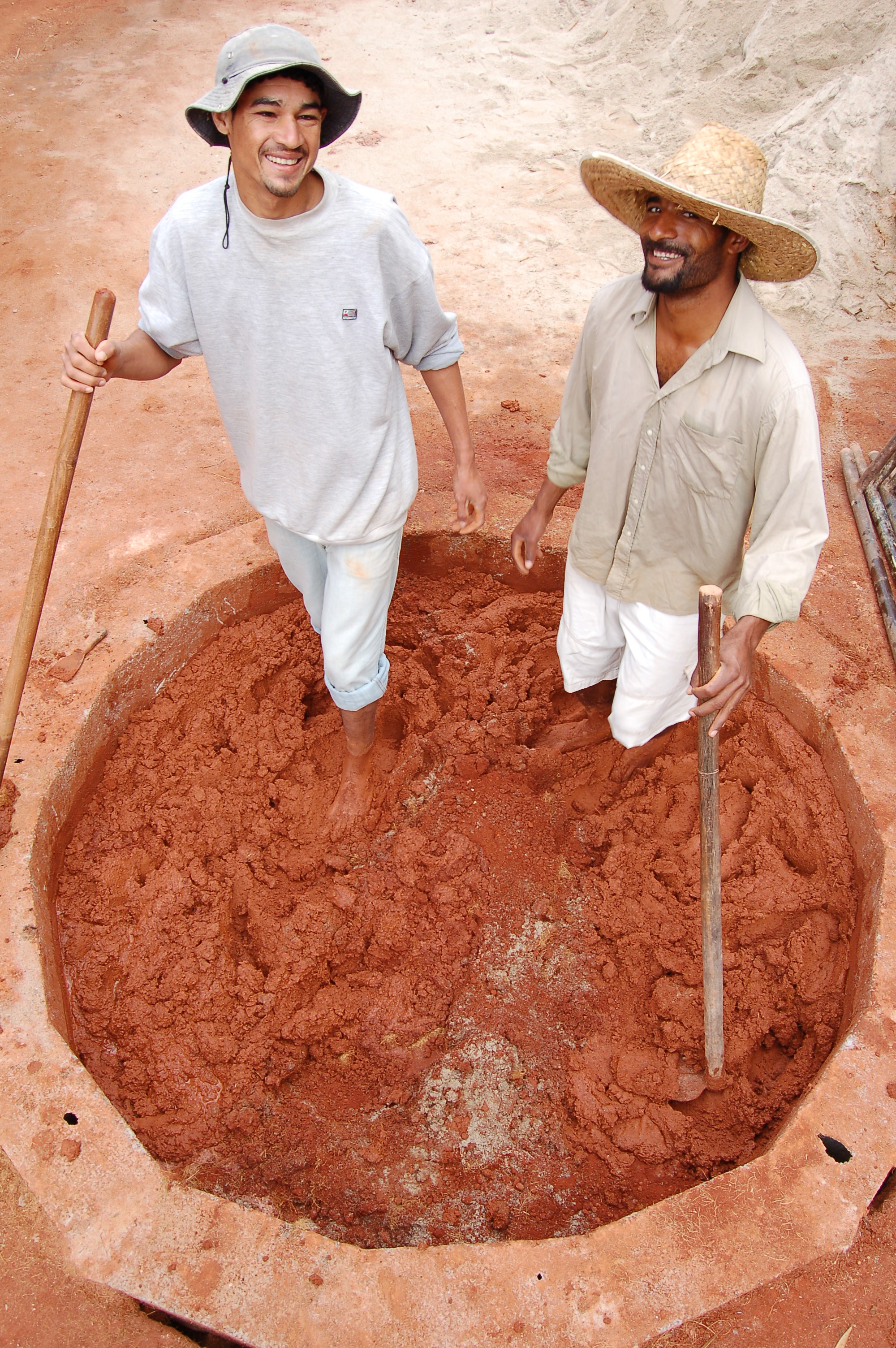 Usamos a casa do caseiro como laboratório para aprender a técnica do pau a pique e, com a equipe treinada, começamos a construção do casarão. Lidar com o barro transformava todo o canteiro de obra numa festa.