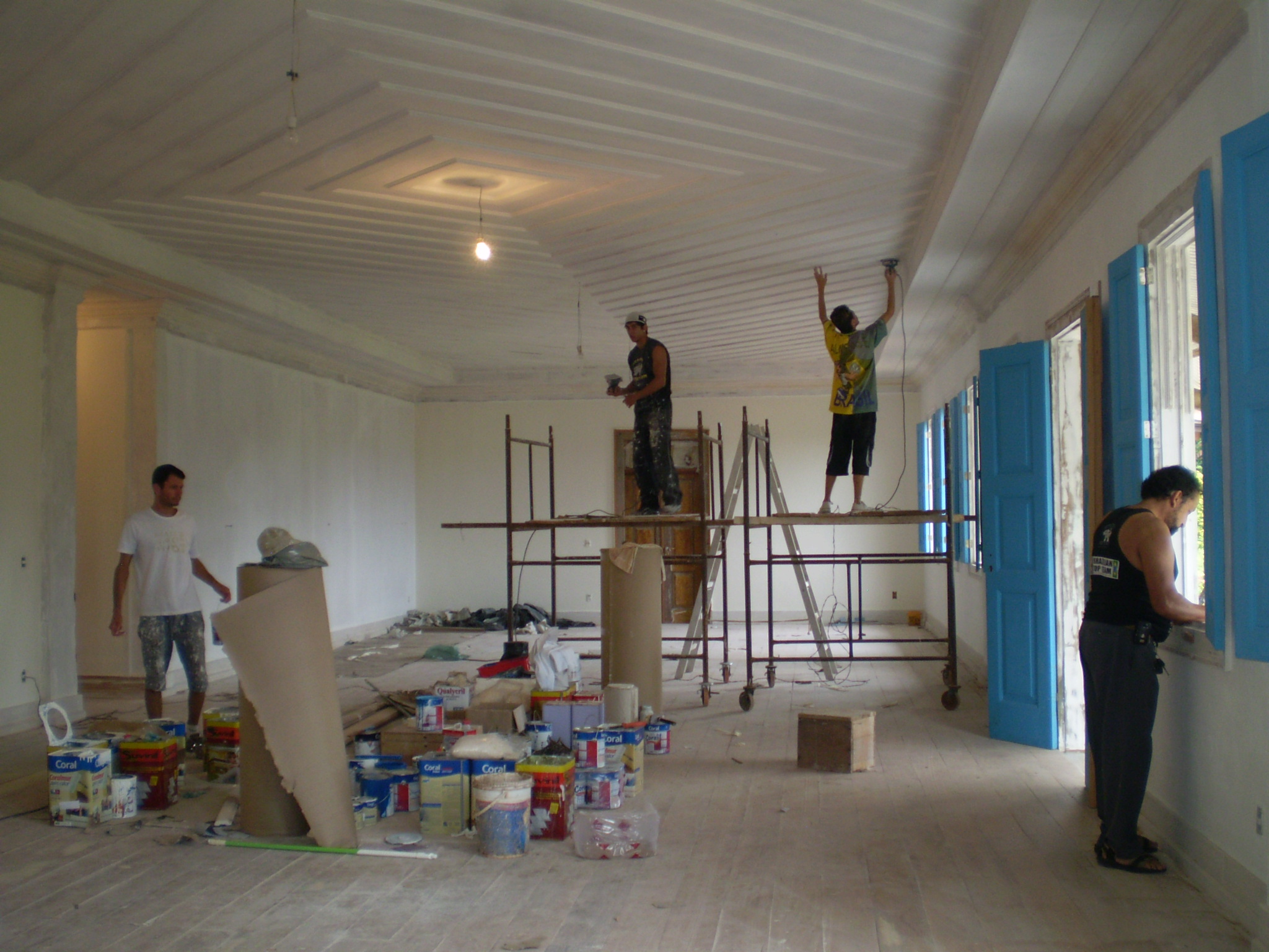 Para restaurar as peças antigas de madeira, confeccionar novas com madeira de demolição, montamos uma marcenaria na obra. Produzimos um número incontável de molduras de forro, adornos de janelas e portas, milhares de treliças e muita restauração de peças originais danificadas pelo tempo.